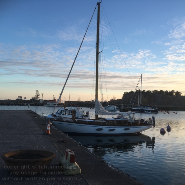Humes: Heräsin keulapunkasta määrätietoisiin askeliin kannella. Kaivauduin ulos makuupussista ja pukeuduin samoin kuin aikaisemminkin, villaiseen alusasuun, fleecekerrokseen, purjehdushaalareihin ja talvitakkiin. Jo ennen sitloodaa arvuuttelin liikehdinnän kannella merkitsevän jotain purjehdusteknistä manööveriä ja olin oikeassa. Piccu ja Markku virittelivät spinaakkeria nostovalmiiksi. Rivakka vauhti johtui siitä, että Nynäshamniin ei ollut kuin pari mailia matkaa. Lievästi sanoen tukeva spinnakerbaum meni ensin paikoilleen ja muutaman hetken kulutttua sini-valko-oranssi spinaakkeri nousi, ensimmäisen kerran ties kuinka pitkään aikaan. Ja hyvin veti. Nynäshamn alkoi lähestyä ehkä liiankin nopeasti ja onneksi Tuomas kysyi onko kyseinen punainen viitta meille. Olihan se ja väärällä puolella. Edessä oleva 0,8m matalikko väistettiin ja spinnuilu jatkui vielä hetken aikaa. Sitten purjeet alas, kone käyntiin ja kohti Nynäshamnin satamaa. Ajoin satamaan Picun ohjeiden mukaisesti ja päädyimme kylkiparkkiin. Paikallinen sääennuste lupasi Tukholman lääniin yölämpötilaksi -2 - -8 astetta.
